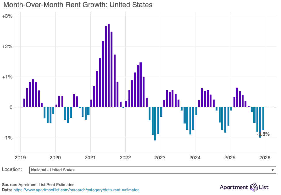 The rental market has been the clearest signal. Apartment List reports the national median rent fell 0.8% in December and is down 1.3% year-over-year (chart above), marking several months of declines and a meaningful pullback from the 2022 peak.
