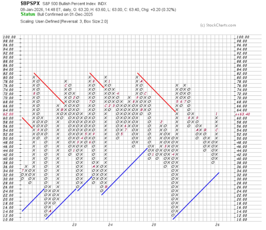 The bullish percent of the S&P 500 currently sits around 63.4%, a sharp rebound from roughly 38% in late November and early December. This indicator measures how many stocks in the index are on technical buy signals. When participation expands this quickly, it typically reflects improving breadth and underlying momentum—conditions more consistent with a healthy market than one bracing for economic trouble.